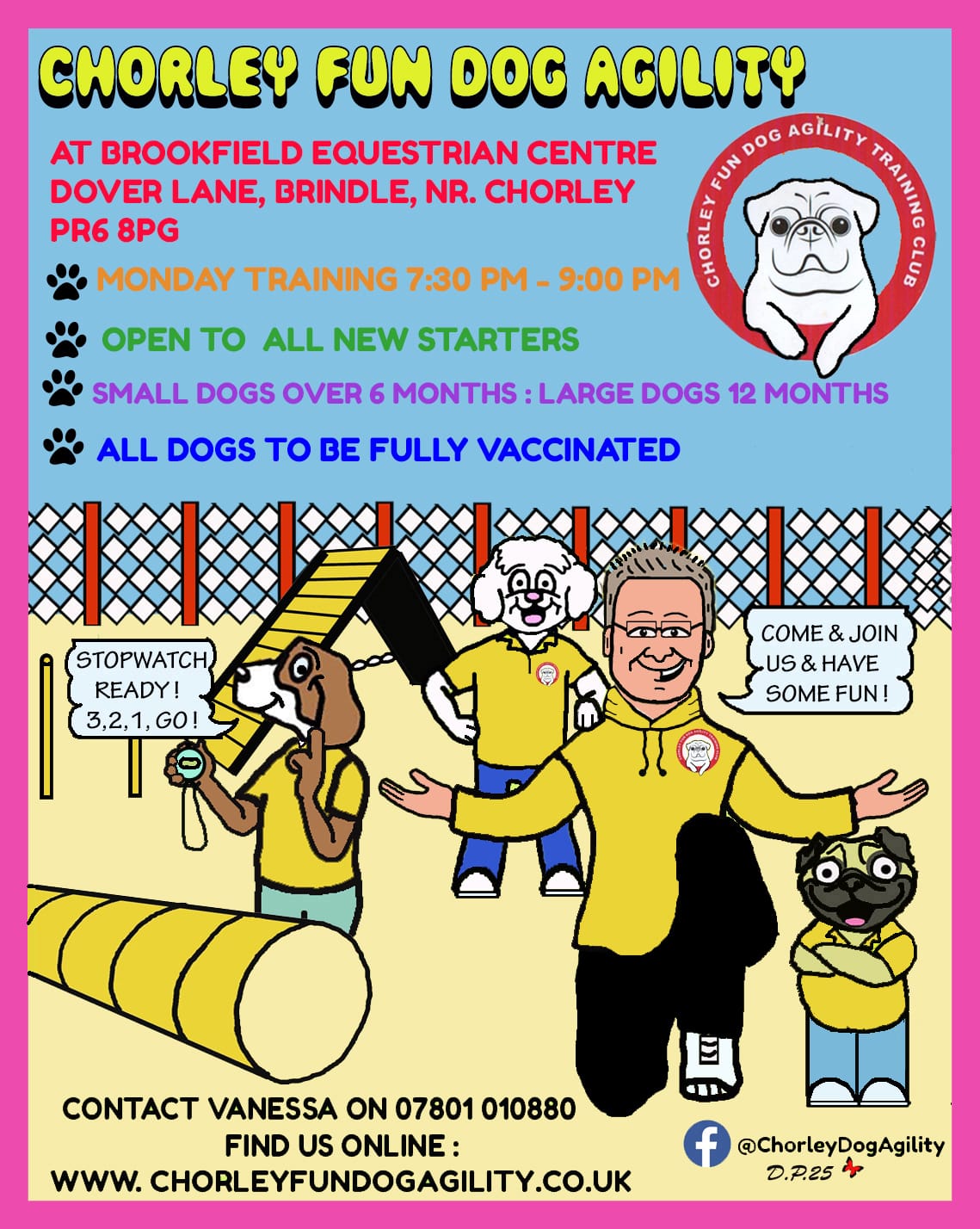 Welcome to Chorley Fun Dog Agility Training Club. We are a fully insured fun dog agility club for small and medium dogs from 6 months old and from 12 months old for large dogs. We are not a competition training club. It is a fun social evening once a week to socialise dogs and their owners. We are proud of the club that Vanessa McLeod started in September 2012 and is still very much our Club leader today.